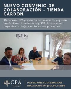 La firma CARDON (Rivadavia 215, Trelew), representada por la Sra. Solange Cartechini, y el Colegio de Abogados de la Circunscripción Judicial de Trelew, representado por su Presidente Dr. Agustín Baroni y con la presencia de la Coordinadora de la Comisión de Relaciones Institucionales del Colegio, Dra Mabel Balado, celebraron un Convenio Marco con beneficios exclusivos para los matriculados.